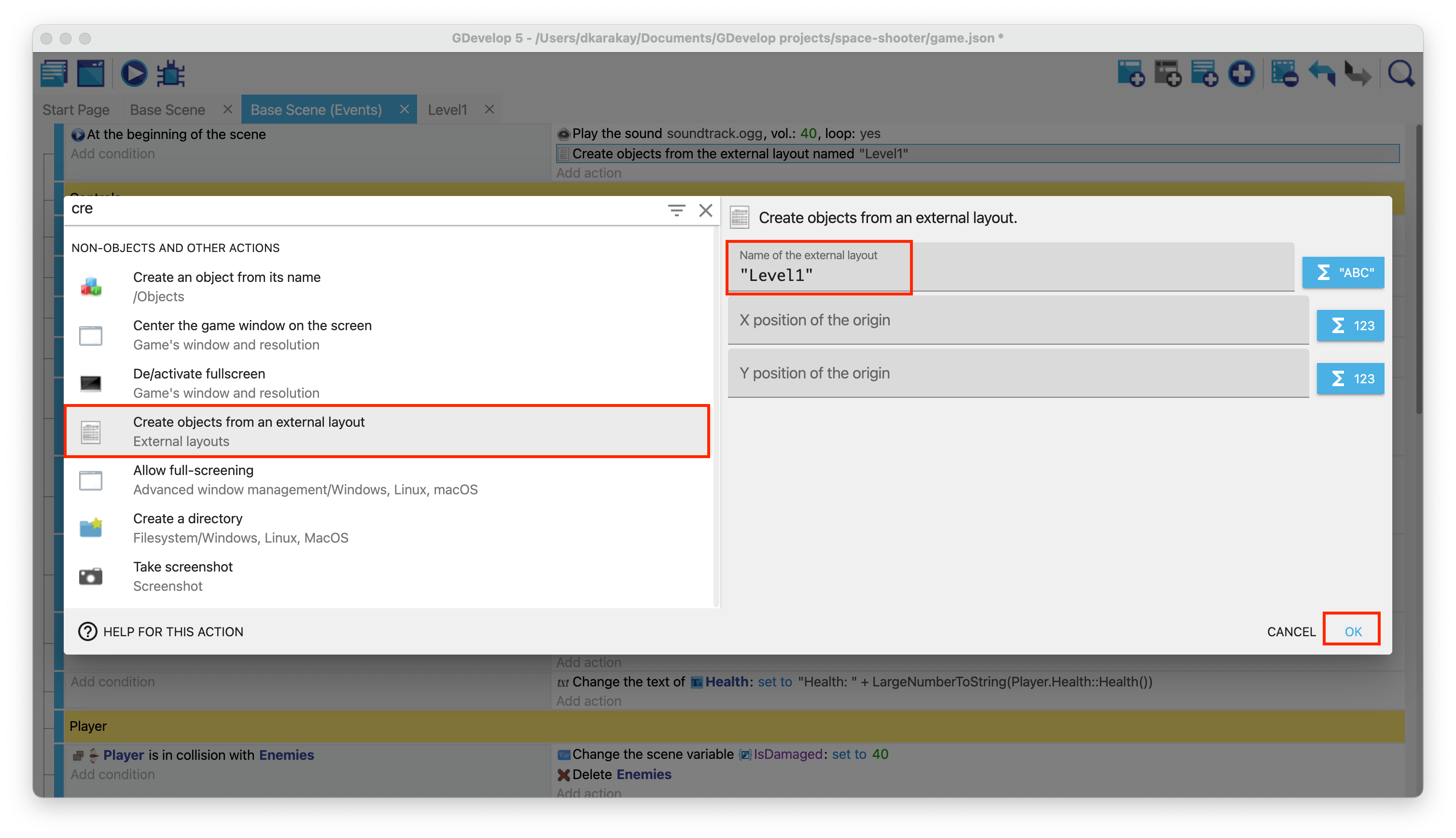 Open the events of Base Scene and find the event to create objects from external layouts.